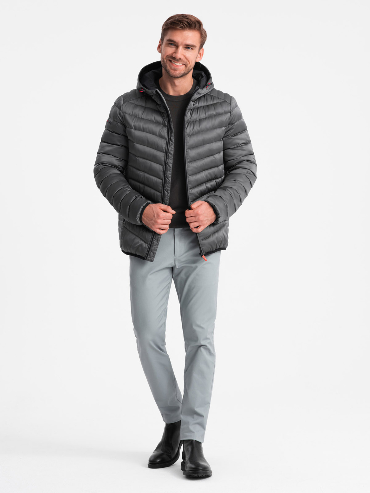Muška prošivana jakna s kapuljačom - svetlo siva V4 OM-JAHP-0252 Ombre Clothing
