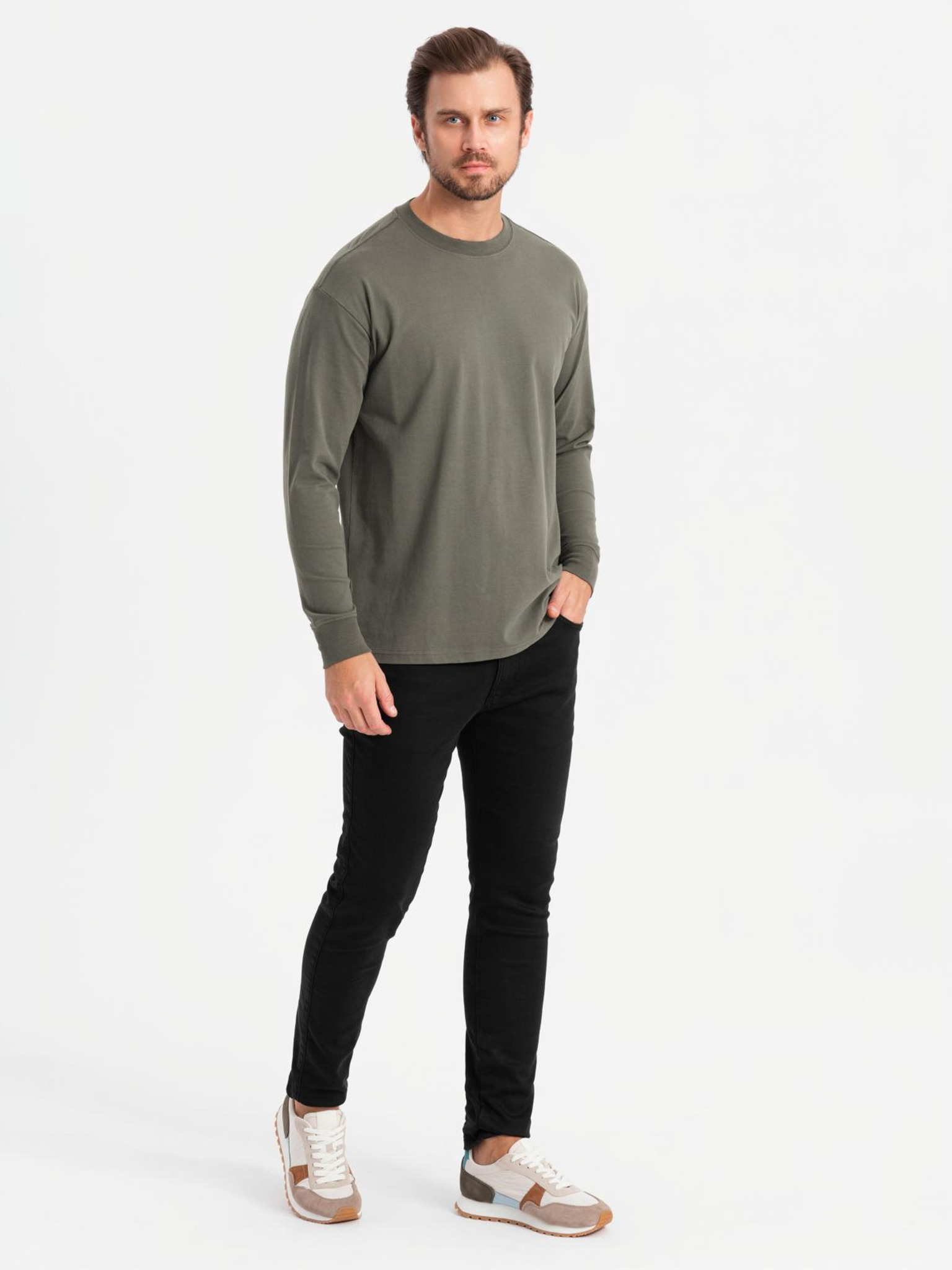 LOOSE FIT muška pamučna majica dugih rukava s okruglim izrezom - crna V1 OM-LSBC-0129 Ombre odjeća