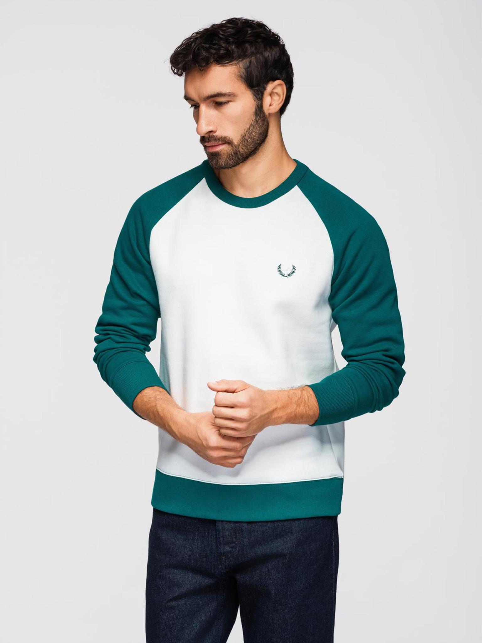 Muška kontrastna majica sa raglan rukavima - kremasta i tamno zelena V1 OM-SSNZ-0239 Ombre Clothing