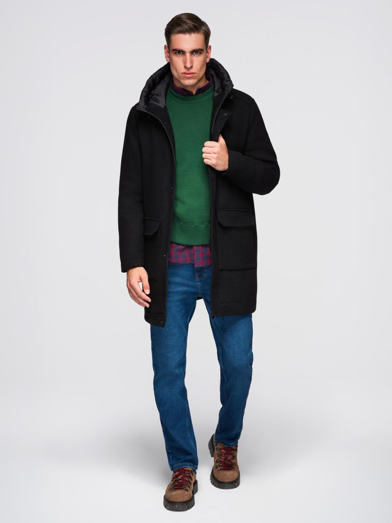 Muški vuneni kaput s kapuljačom - svijetlo smeđi V1 OM-COWC-0131 Ombre Clothing