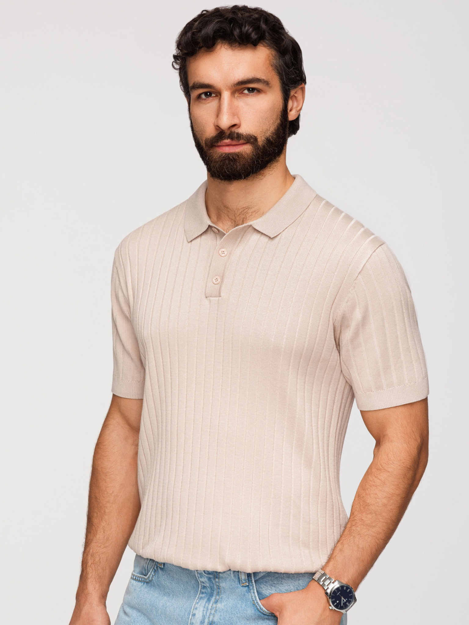 Muška polokošulja SLIM FIT od viskozne s okomitim rebrastim vezom - maslinasto zelena V4 OM-POSS-0169 Ombre Clothing