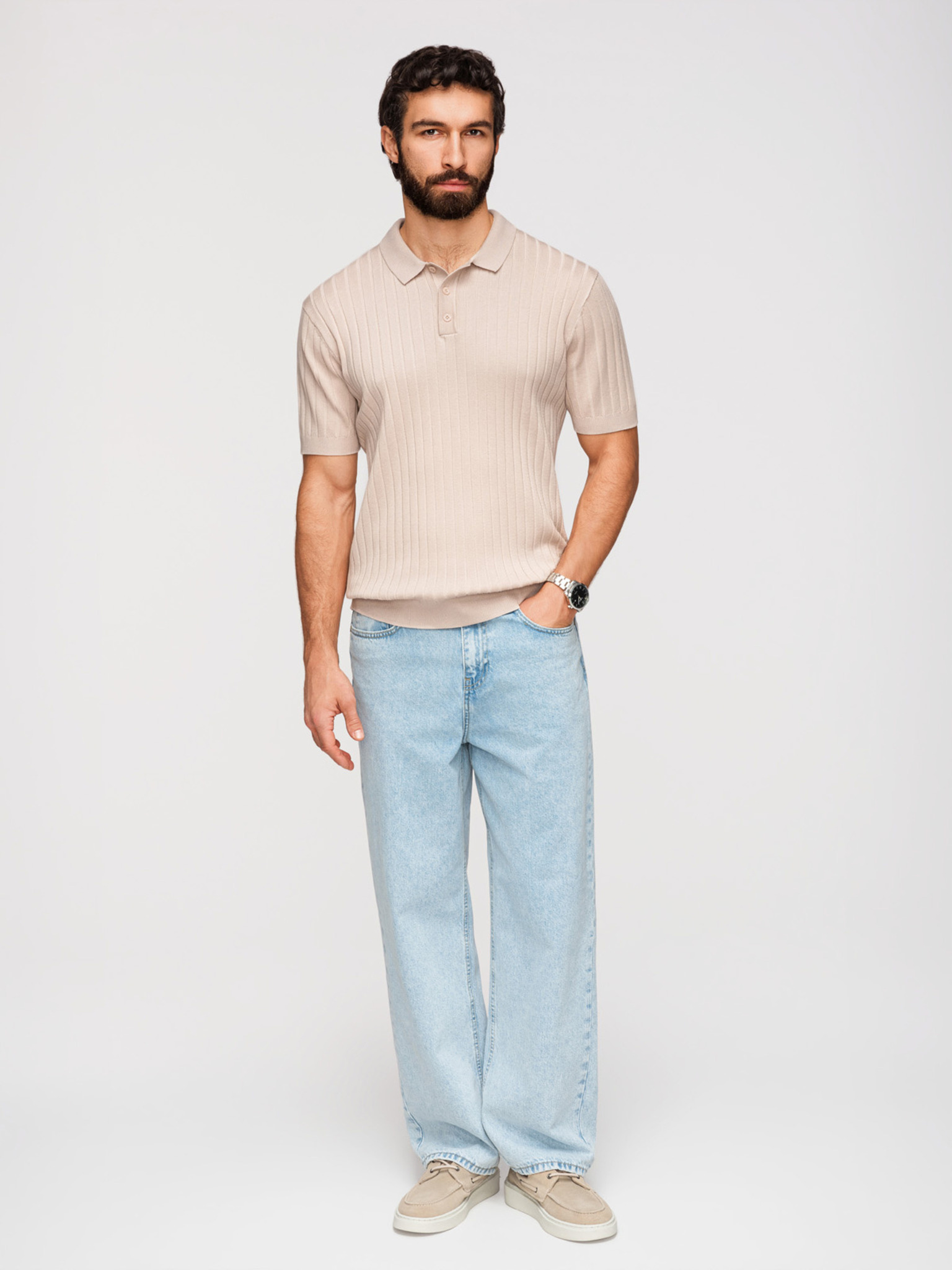 Muški polo pulover sa vezom na prsima - bijeli V2 OM-POLS-0140 Ombre Clothing