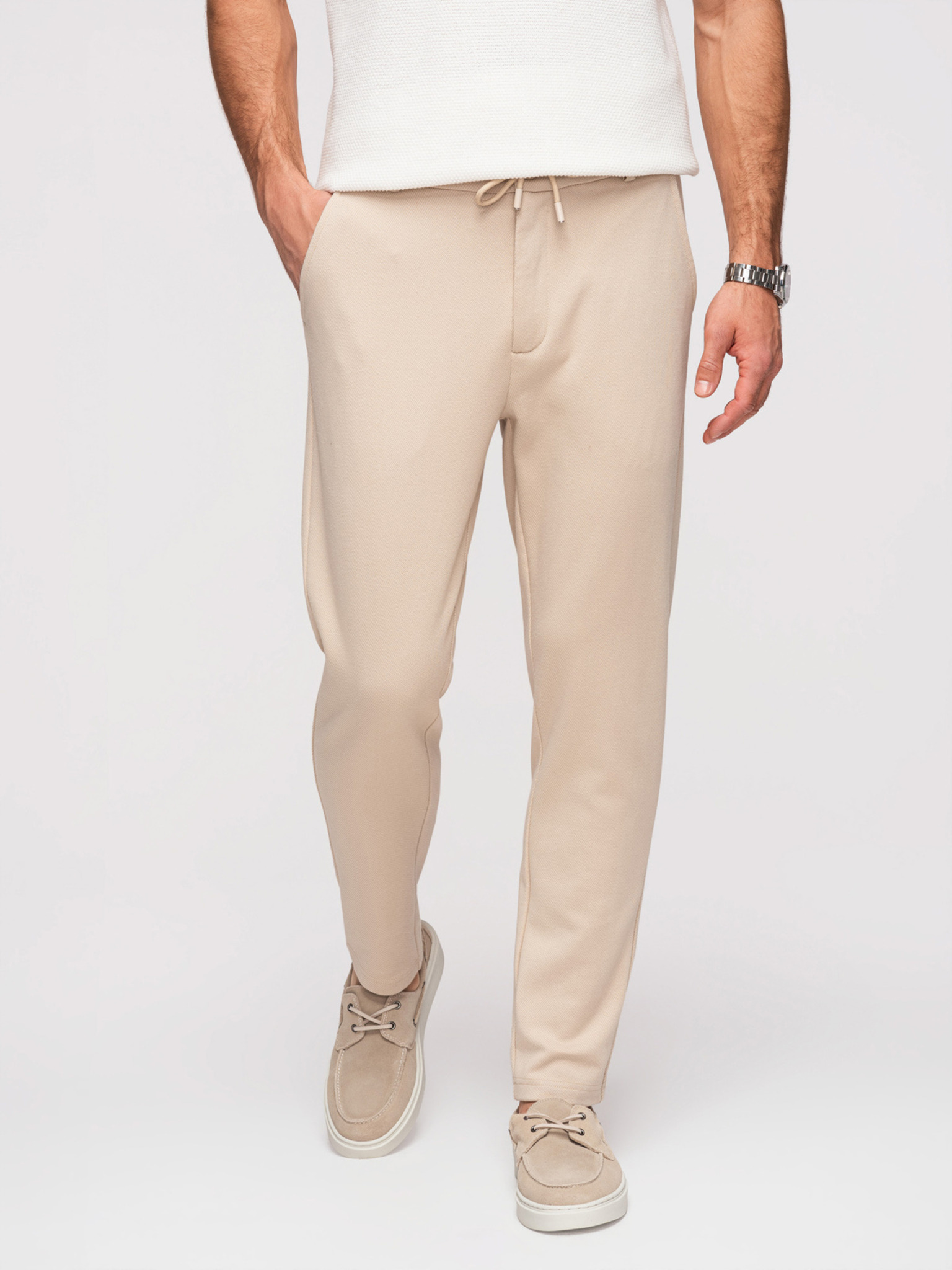 Muške opuštene hlače CARROT FIT od žakard pletenine - bež V2 OM-PACP-0292 Ombre Clothing