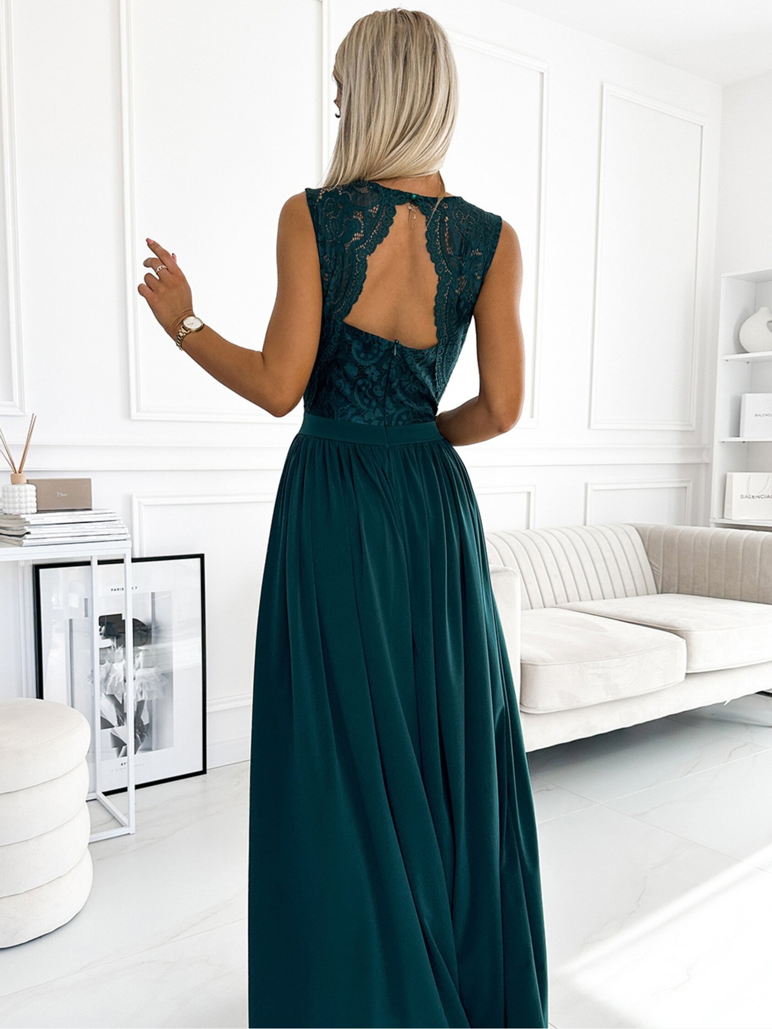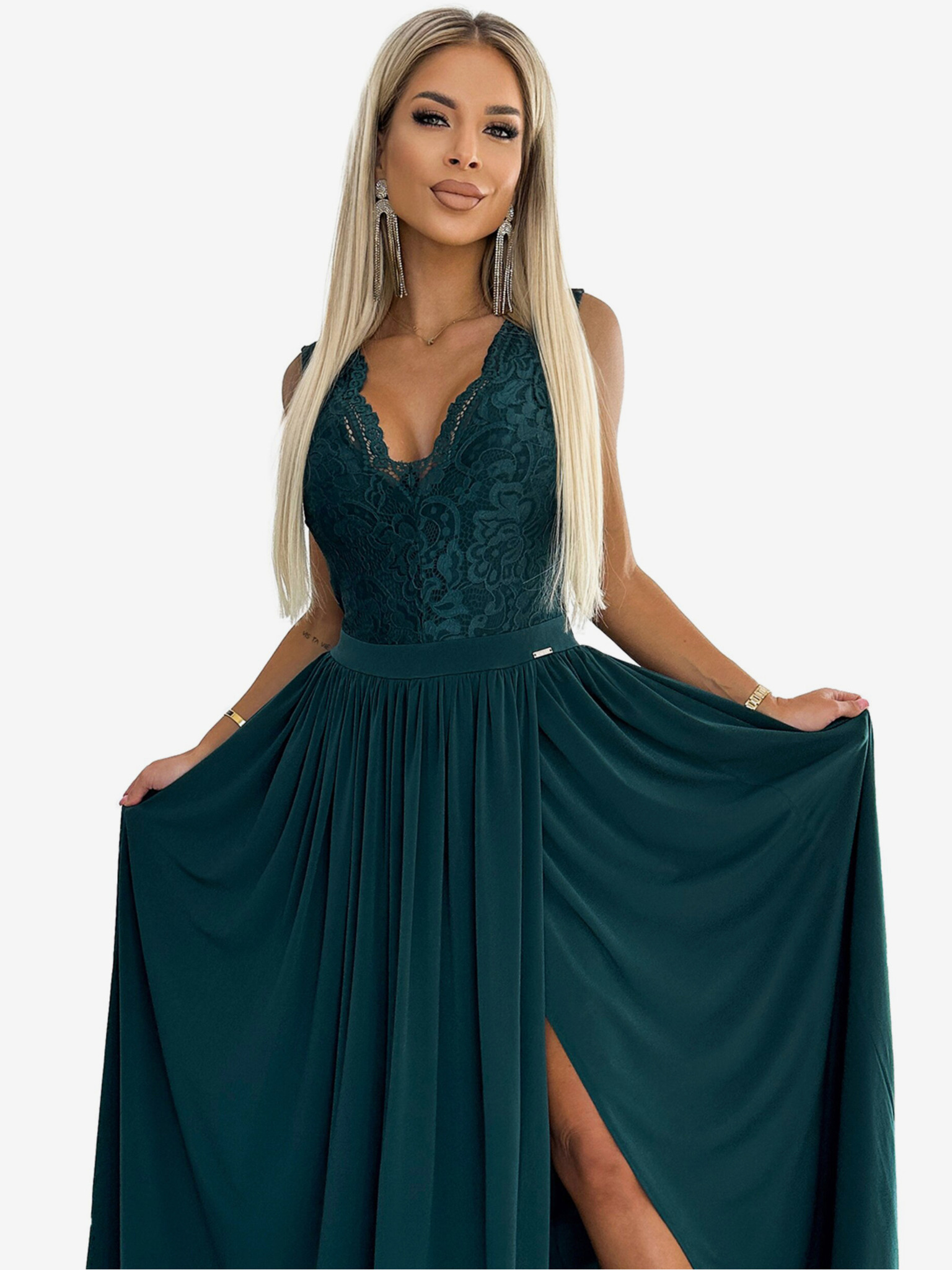 Elegantna duga haljina s dekolteom od čipke - zelena Numoco AMBER