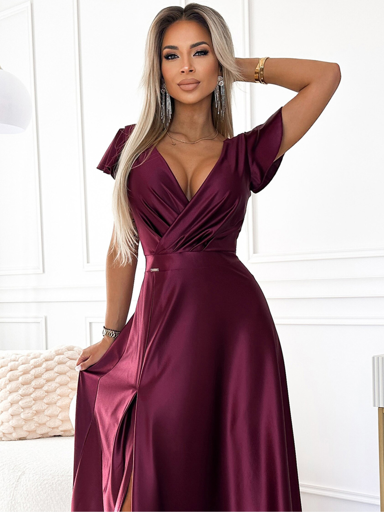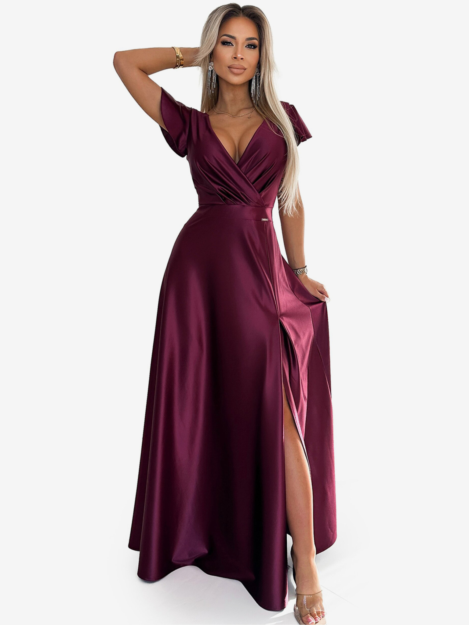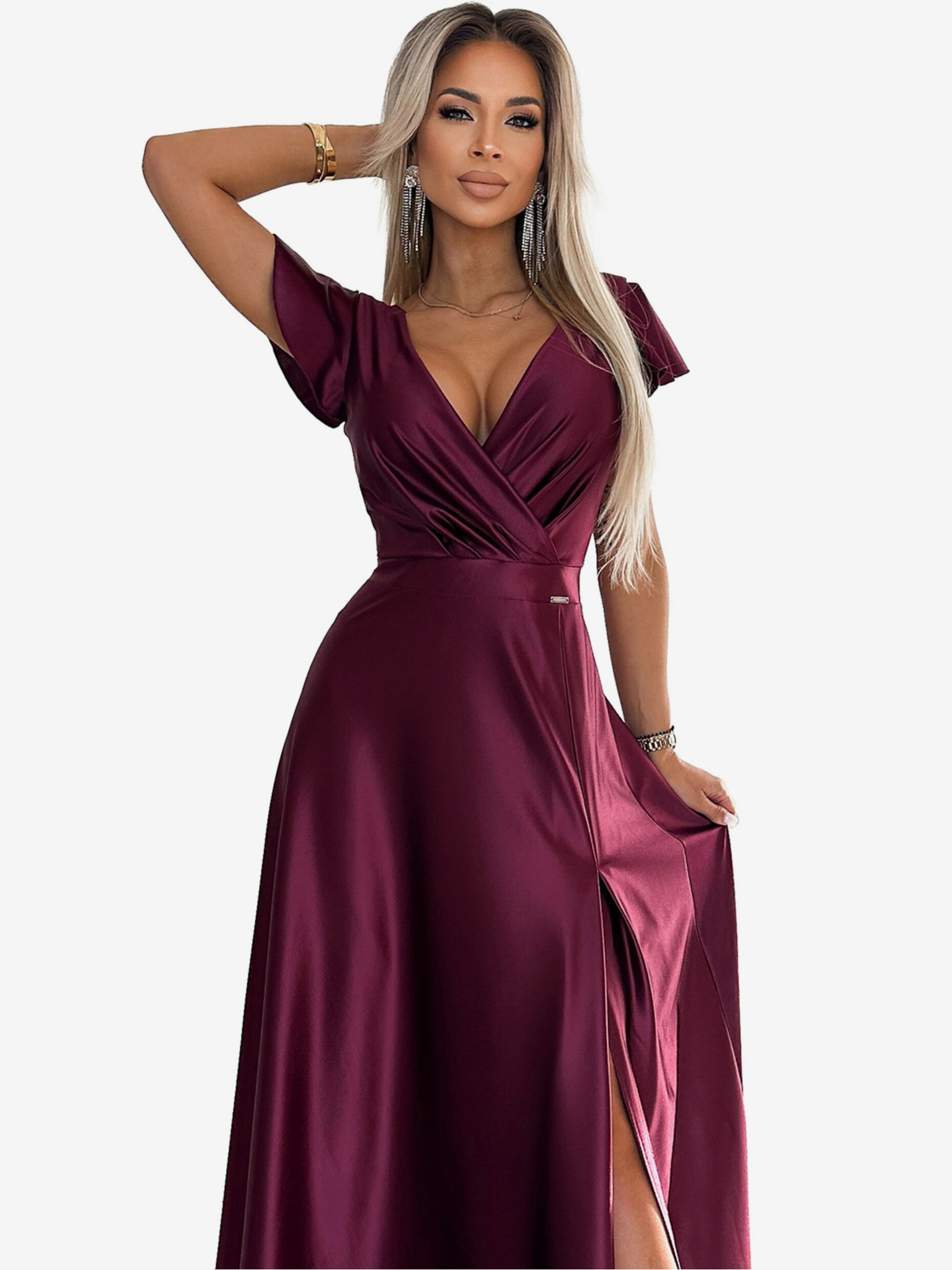 Elegantna duga satenska haljina s dekolteom i prorezom za noge - Boja vina Numoco JULIET
