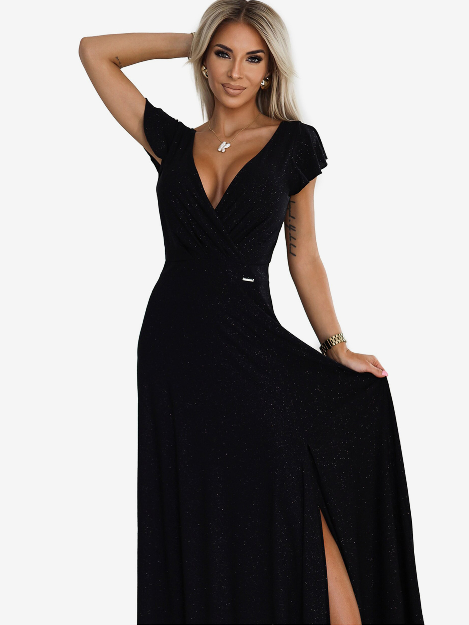 NELA svjetlucava duga haljina s dekolteom, dugim rukavima i prorezom na nogavicama marke Numoco