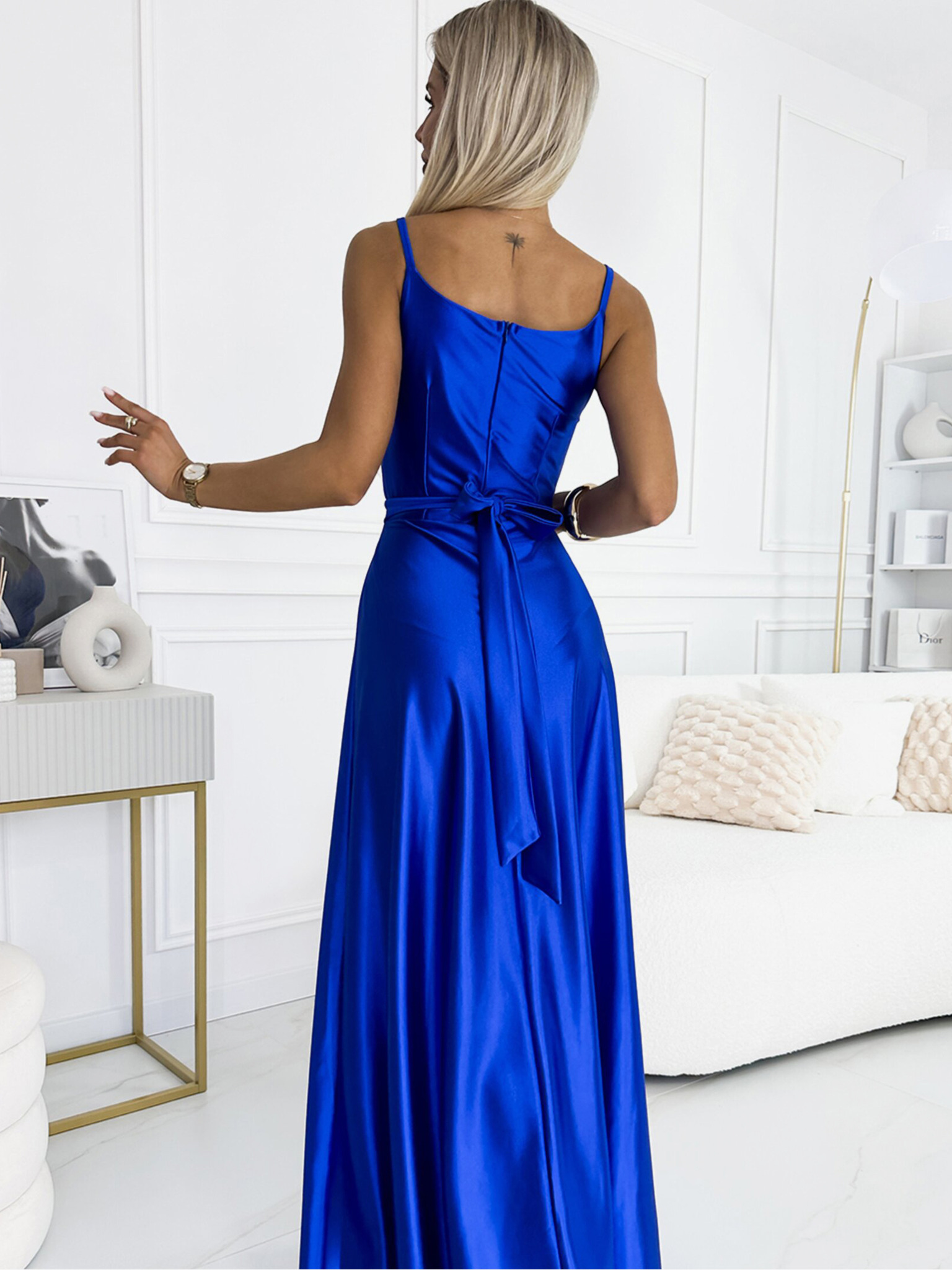 Elegantna duga satenska haljina s izrezom i prorezom na nogama - plava Numoco JULIET