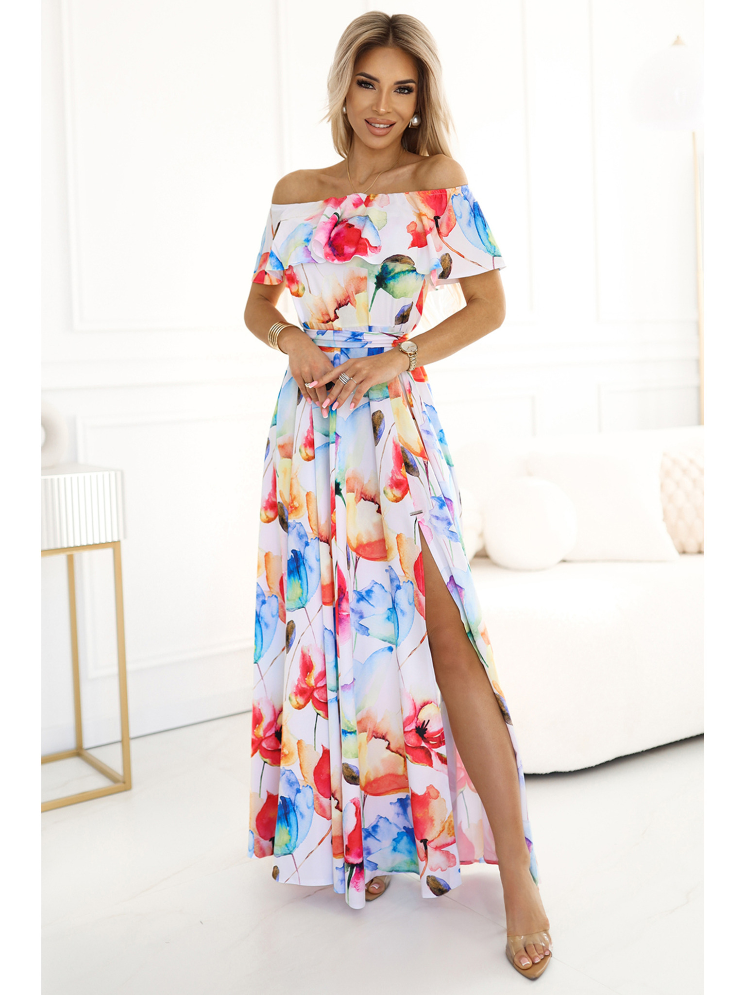 404-11 Sjajna duga haljina s dekolteom i nogavicama s prorezom - bež sa svjetlucavim