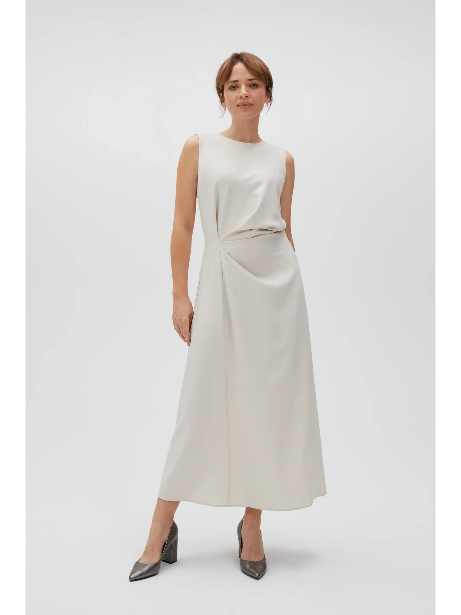 Bež ženska elegantna midi haljina s dekolteom i prorezom Numoco
