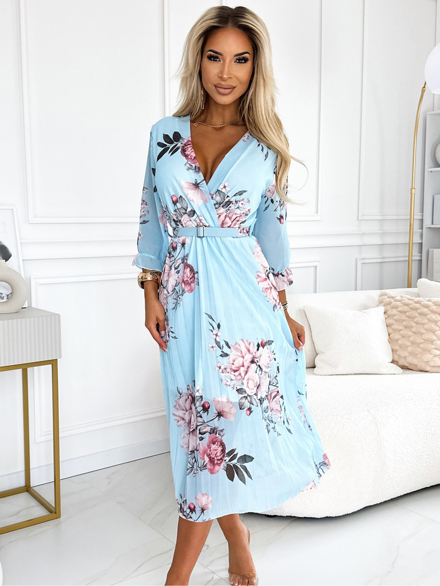 Plisirana midi haljina s dekolteom i remenom - ruža na plavoj pozadini Numoco YUNA