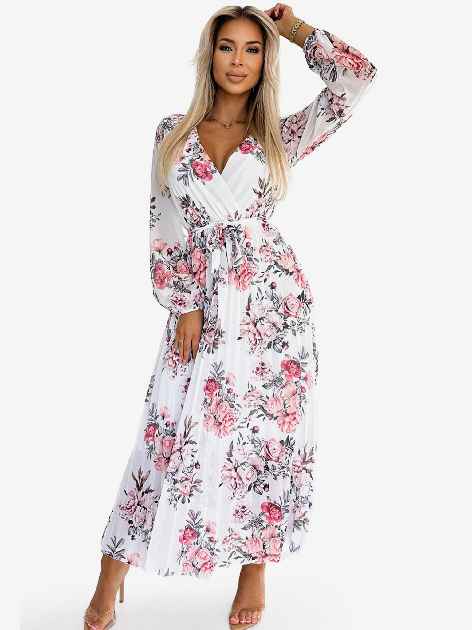 Midi haljina s dugim rukavima i plisiranim remenom - bijela s crvenim ružama Numoco GEPPI