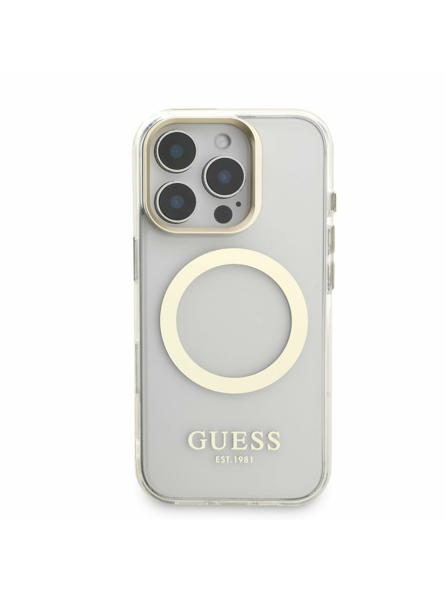Guess IML Gold Outline Stand Camera Frame MagSafe Stražnji Poklopac za iPhone 15 Pro Transparentan