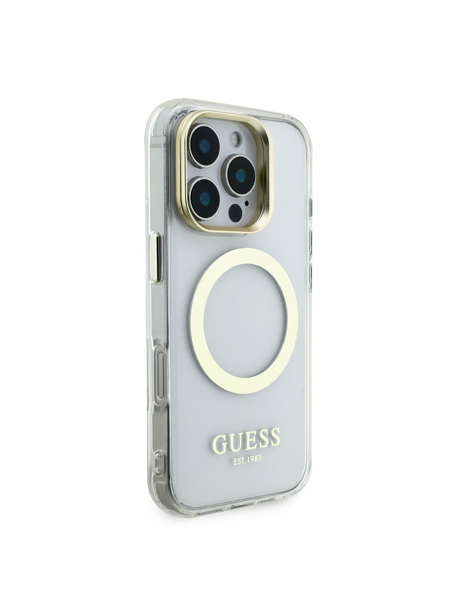 Guess IML Gold Outline Stand Camera Frame MagSafe Stražnji poklopac za iPhone 16 Pro Max Proziran
