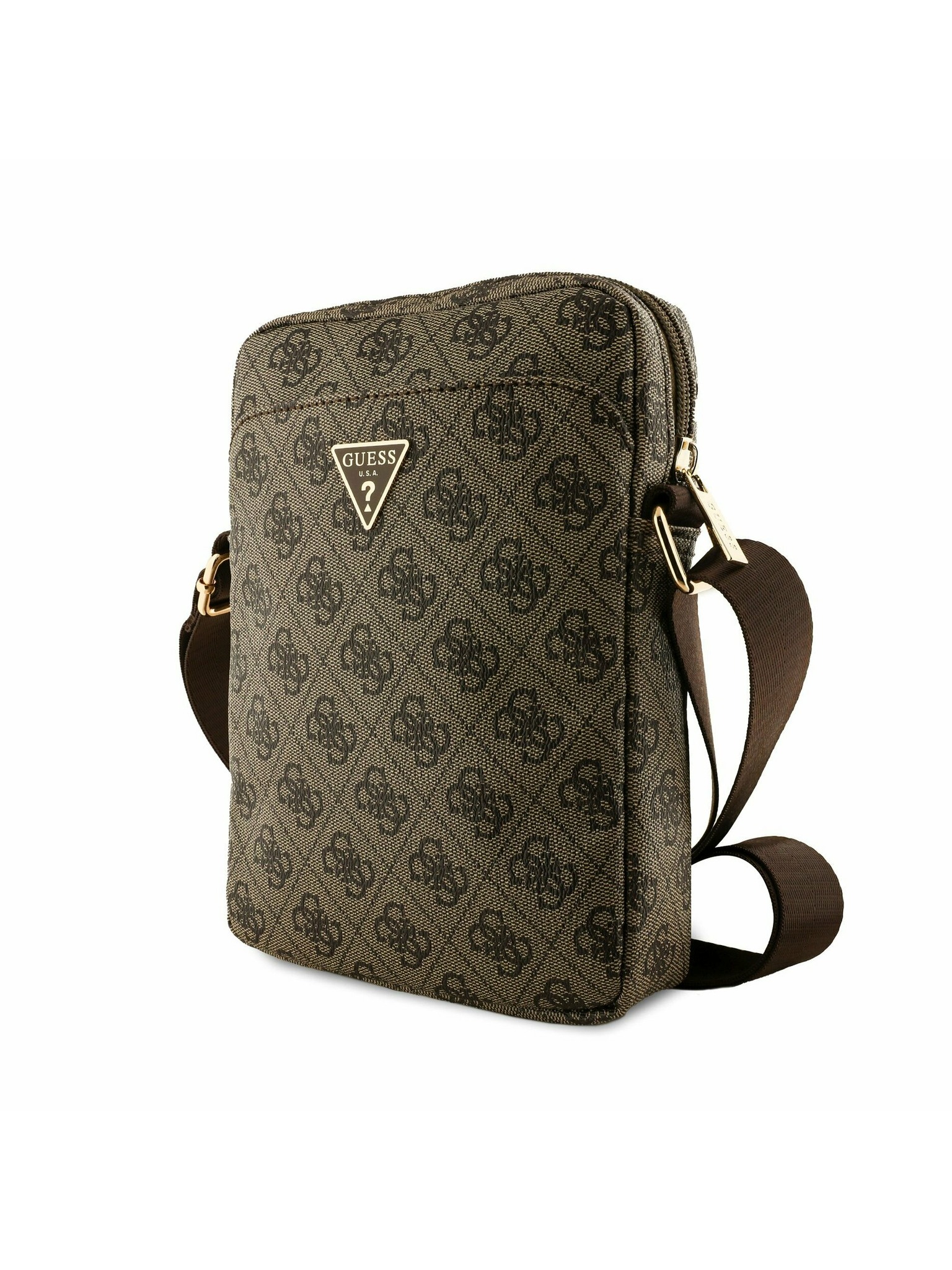 Guess PU 4G Strass Trokutasti Logo Stand Stražnji Poklopac za Kameru MagSafe za iPhone 13 Smeđa