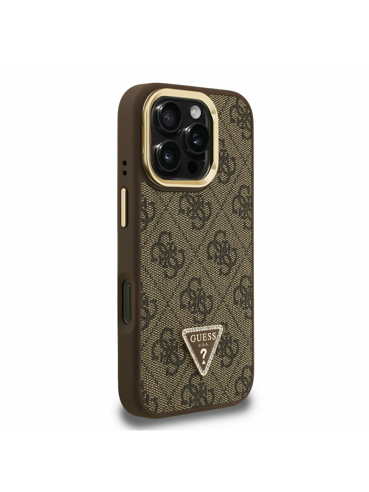 Guess PU 4G Strass Trokutasti Logo Stalak Okvir Kamere MagSafe Stražnji Poklopac za iPhone 16 Brown