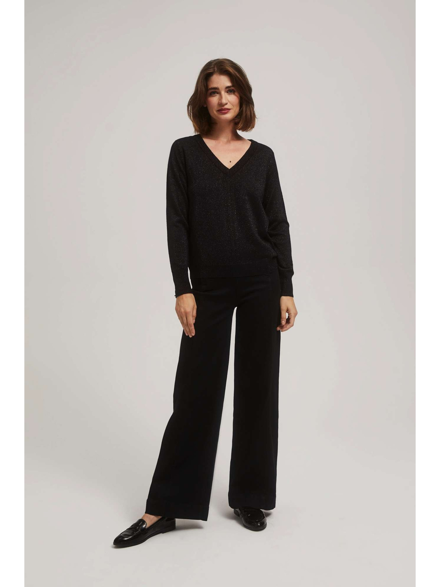 Crni pulover s metalnim vlaknom i V-izrezom Moodo