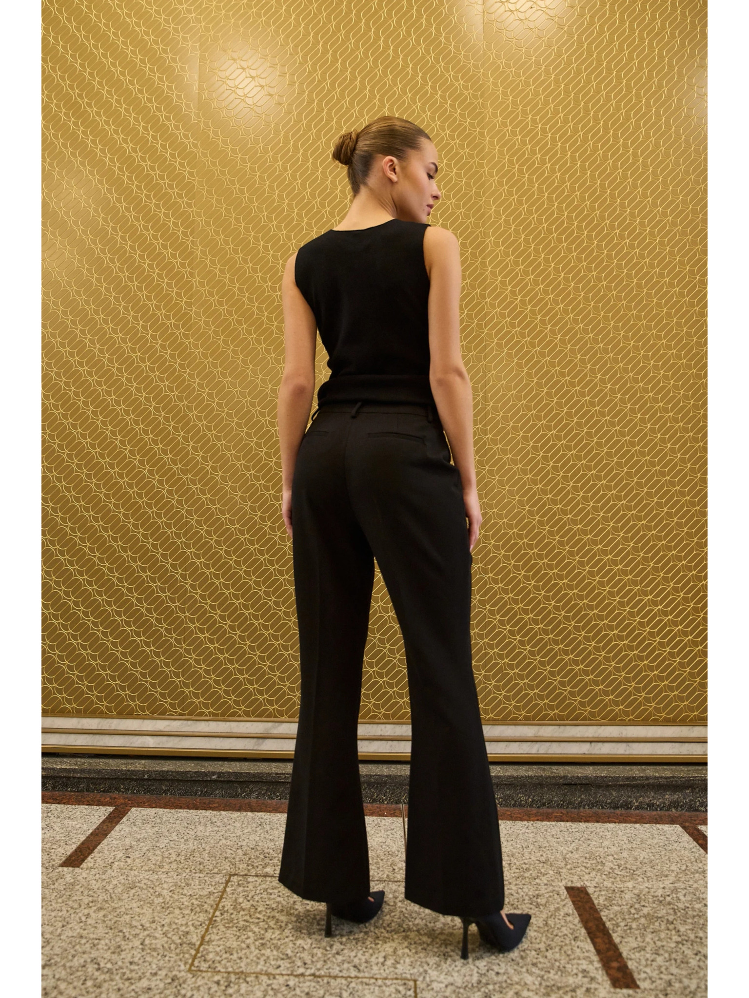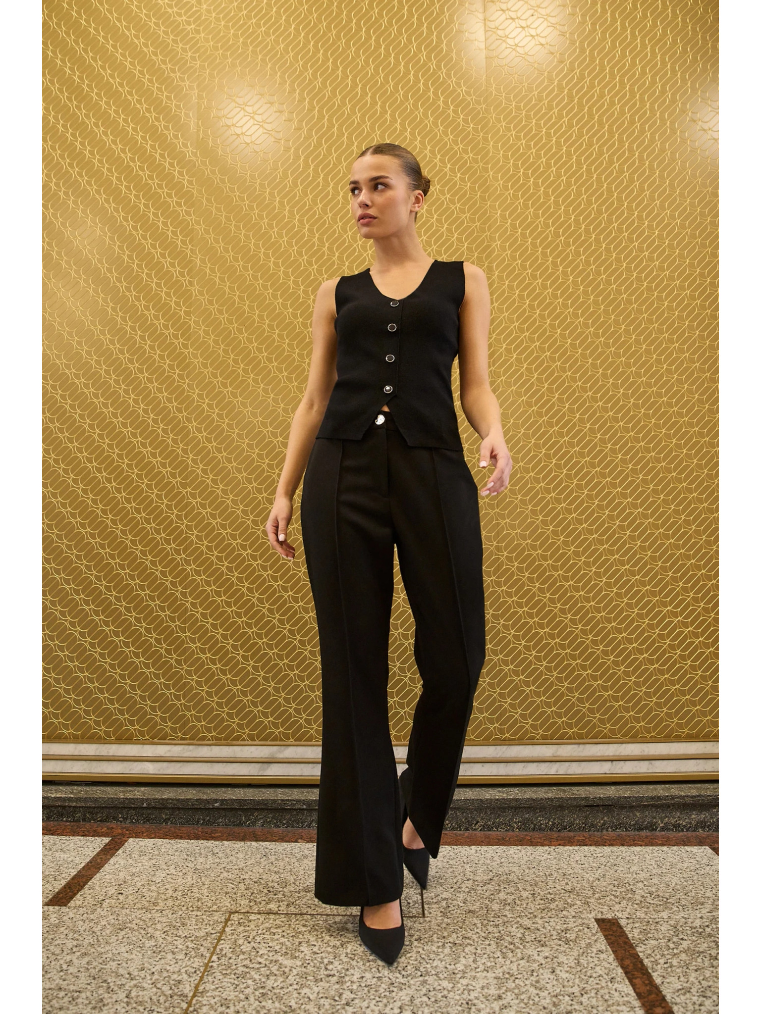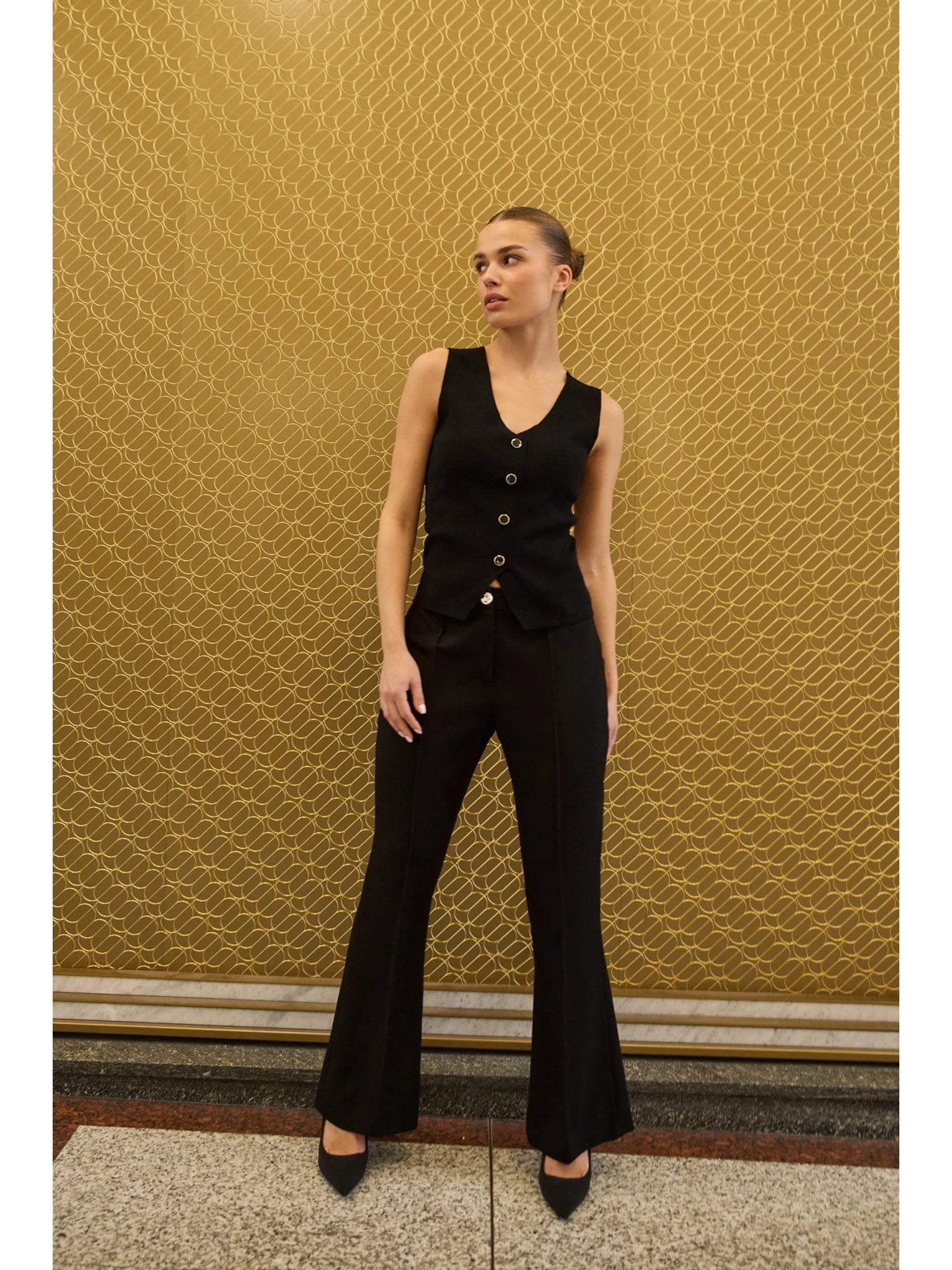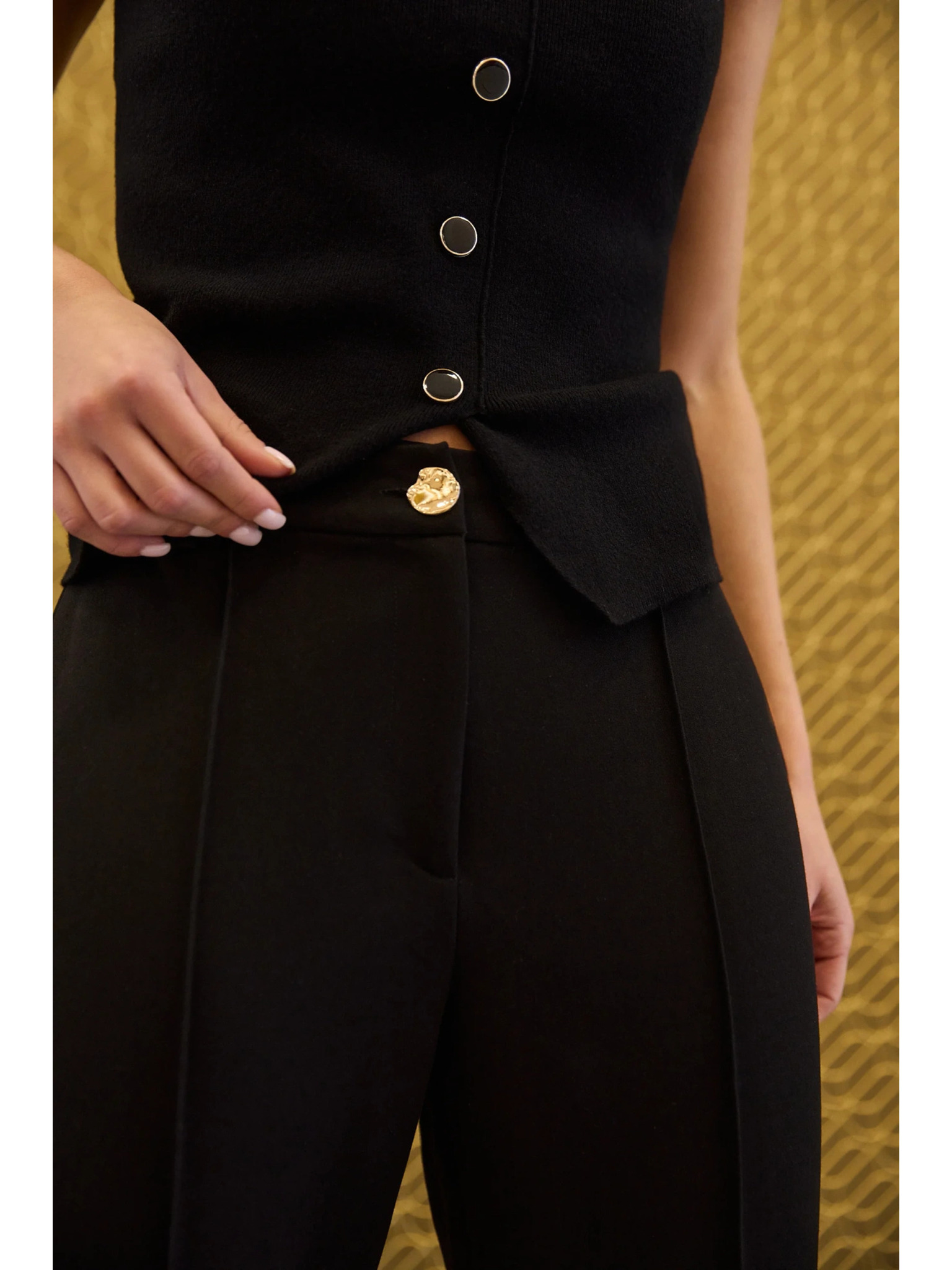 Crne hlače s širokim nogavicama od rebrasto strukturiranog materijala Moodo