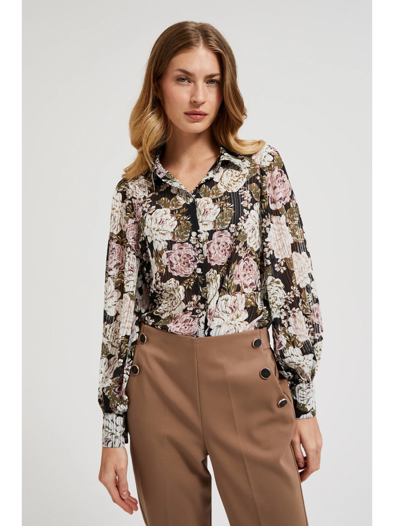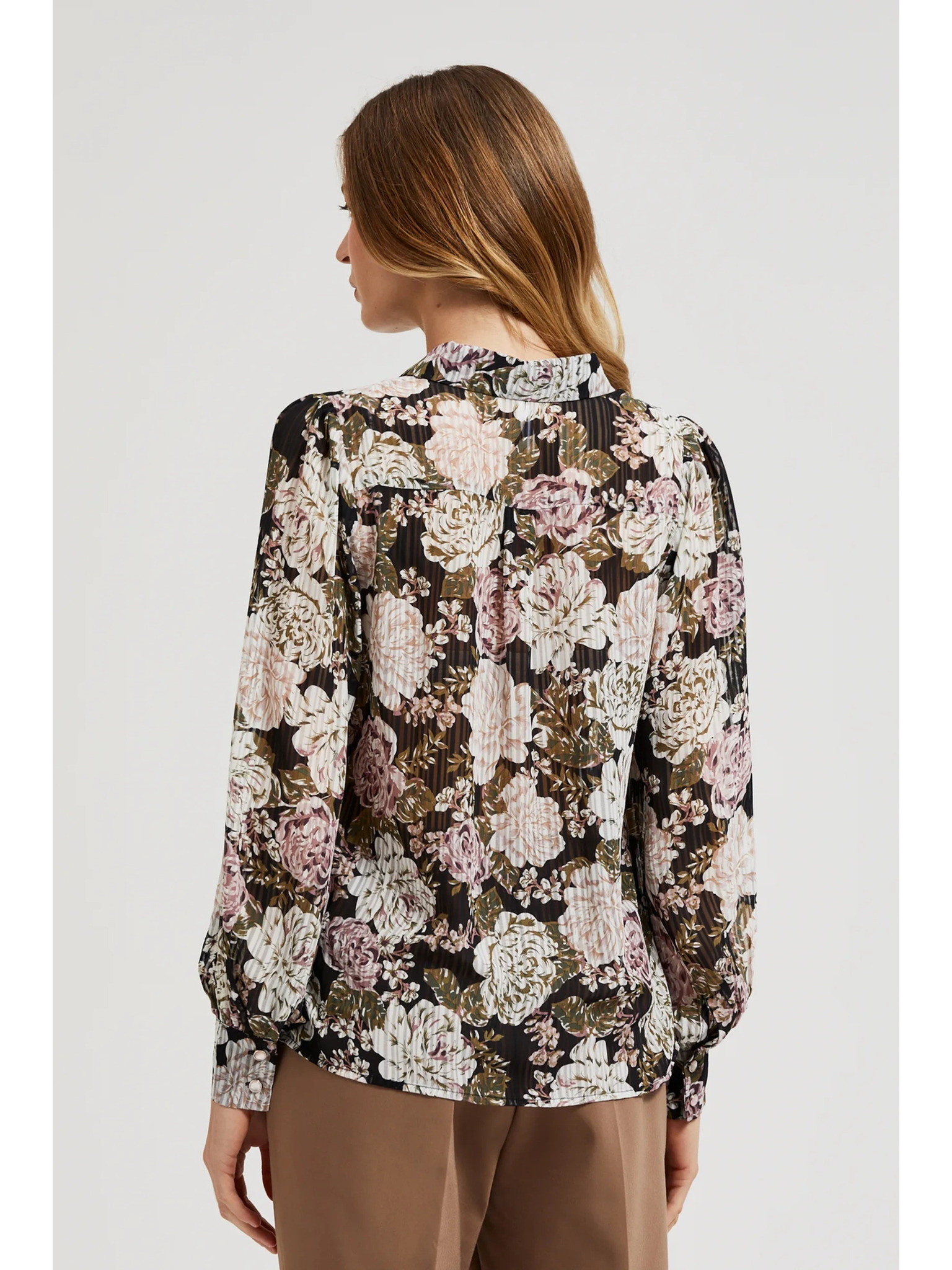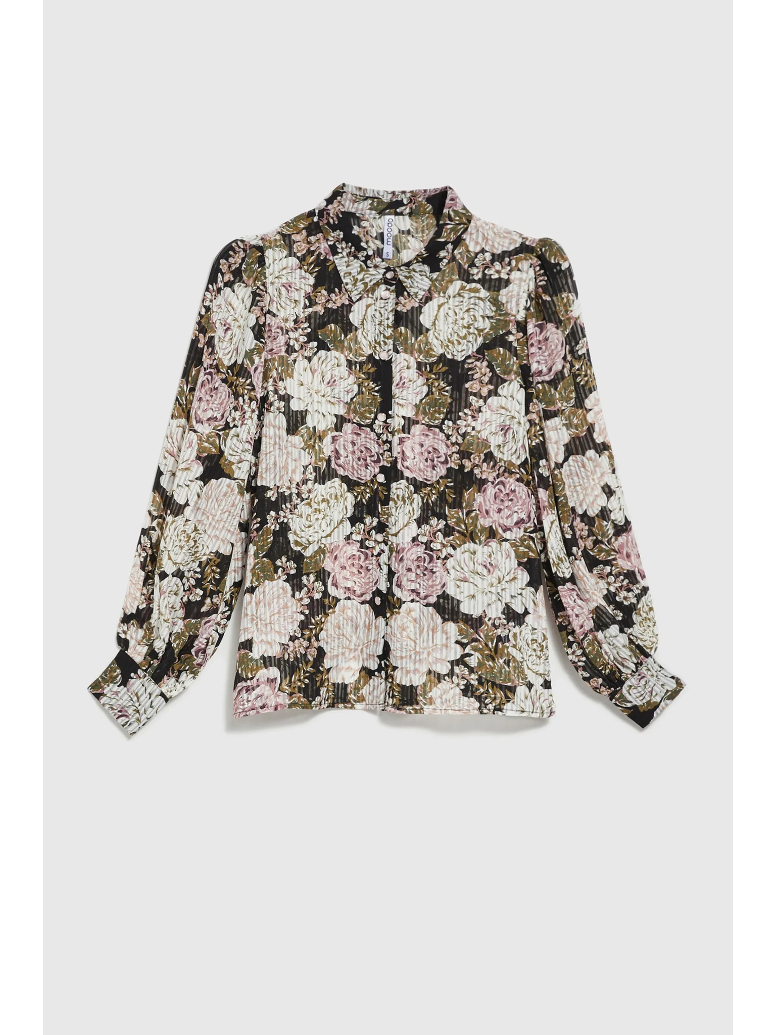 Plisirana crna košulja s cvjetnim uzorkom i balonastim rukavima Moodo