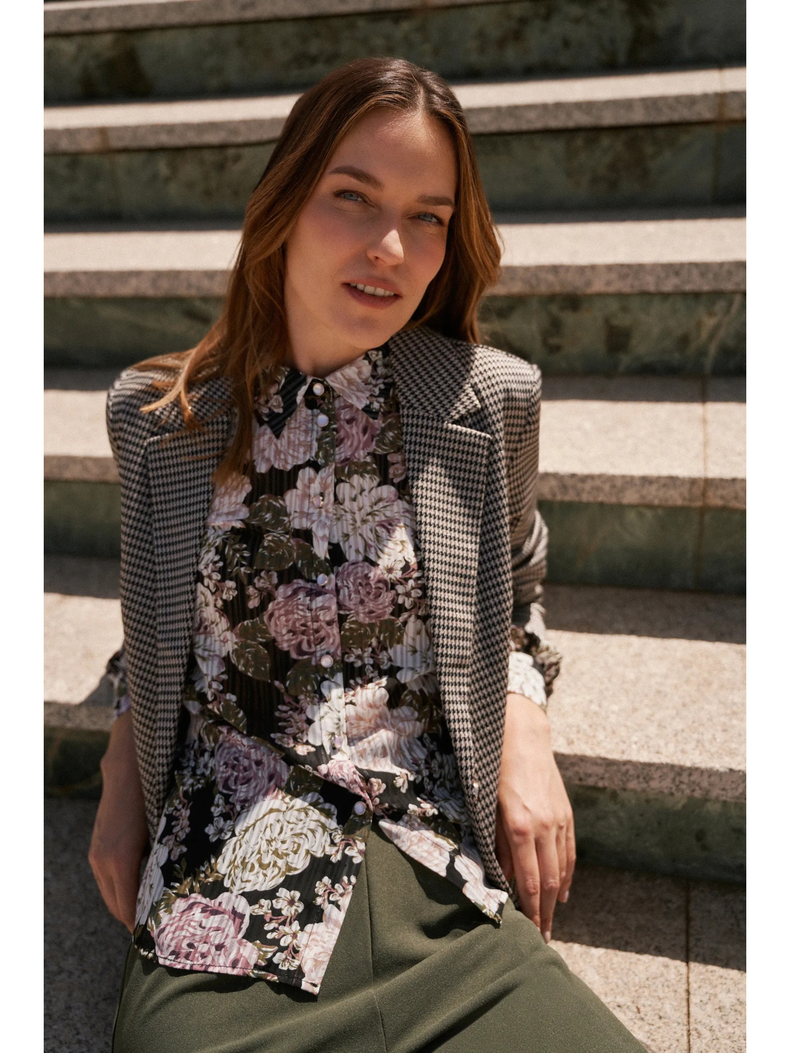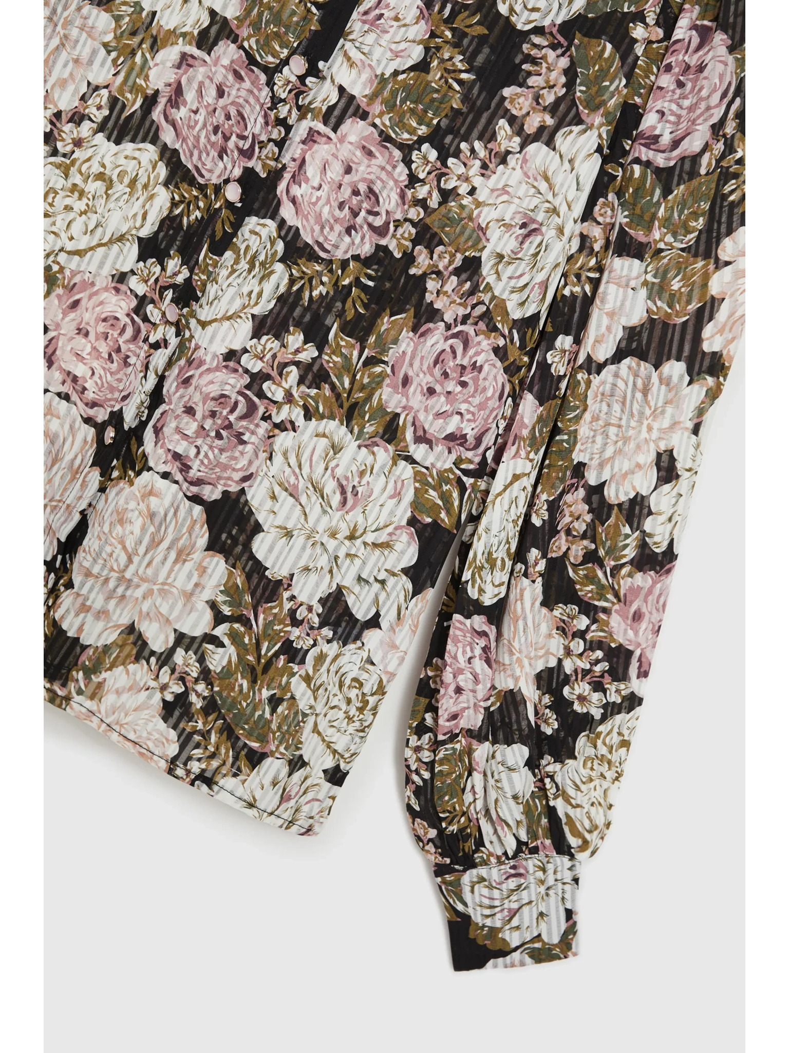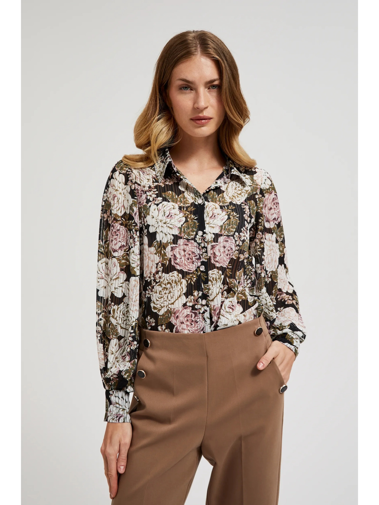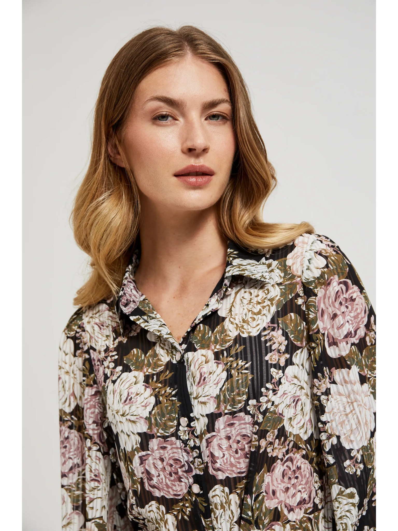 Plisirana crna košulja s cvjetnim uzorkom i balonastim rukavima Moodo