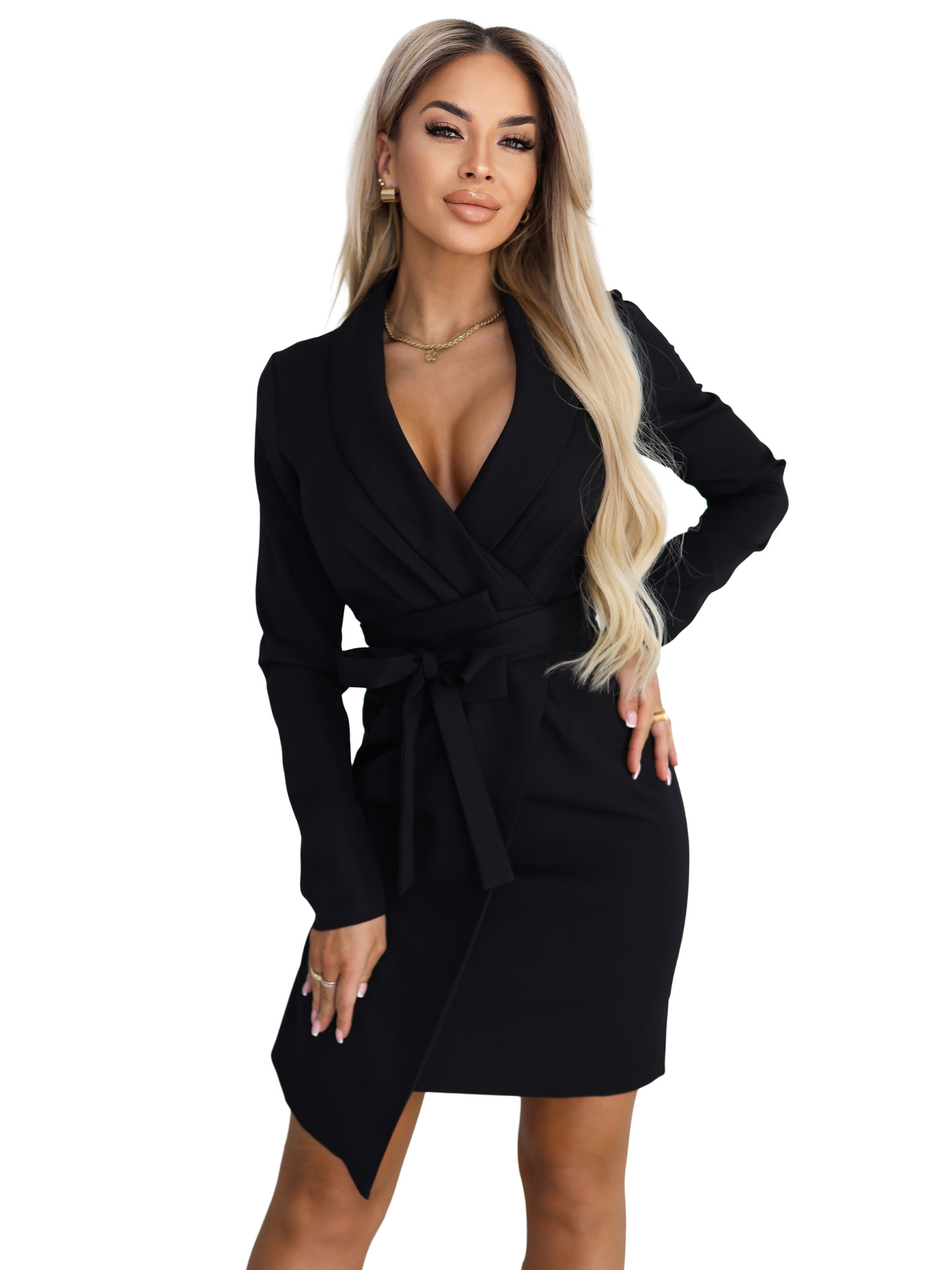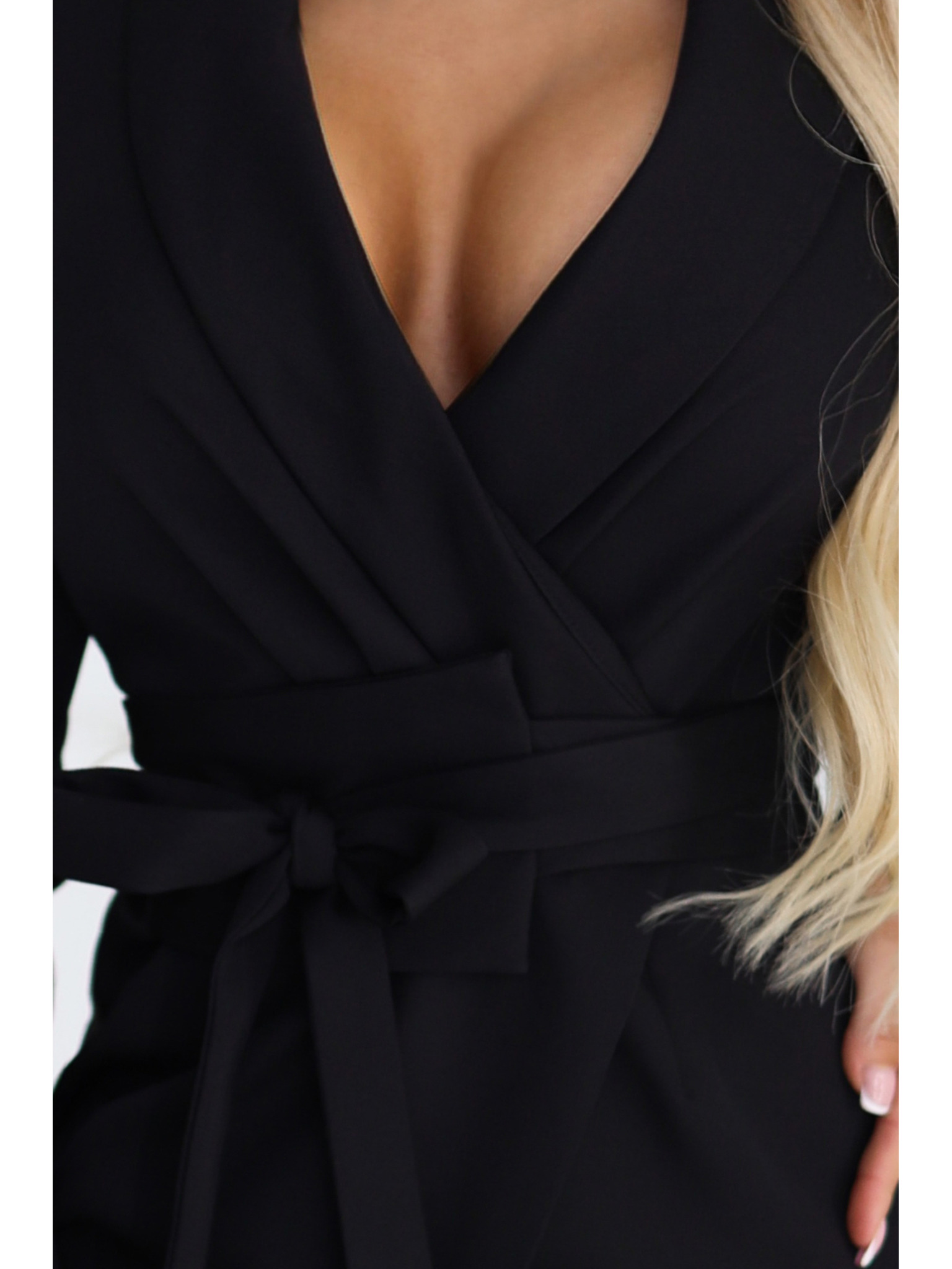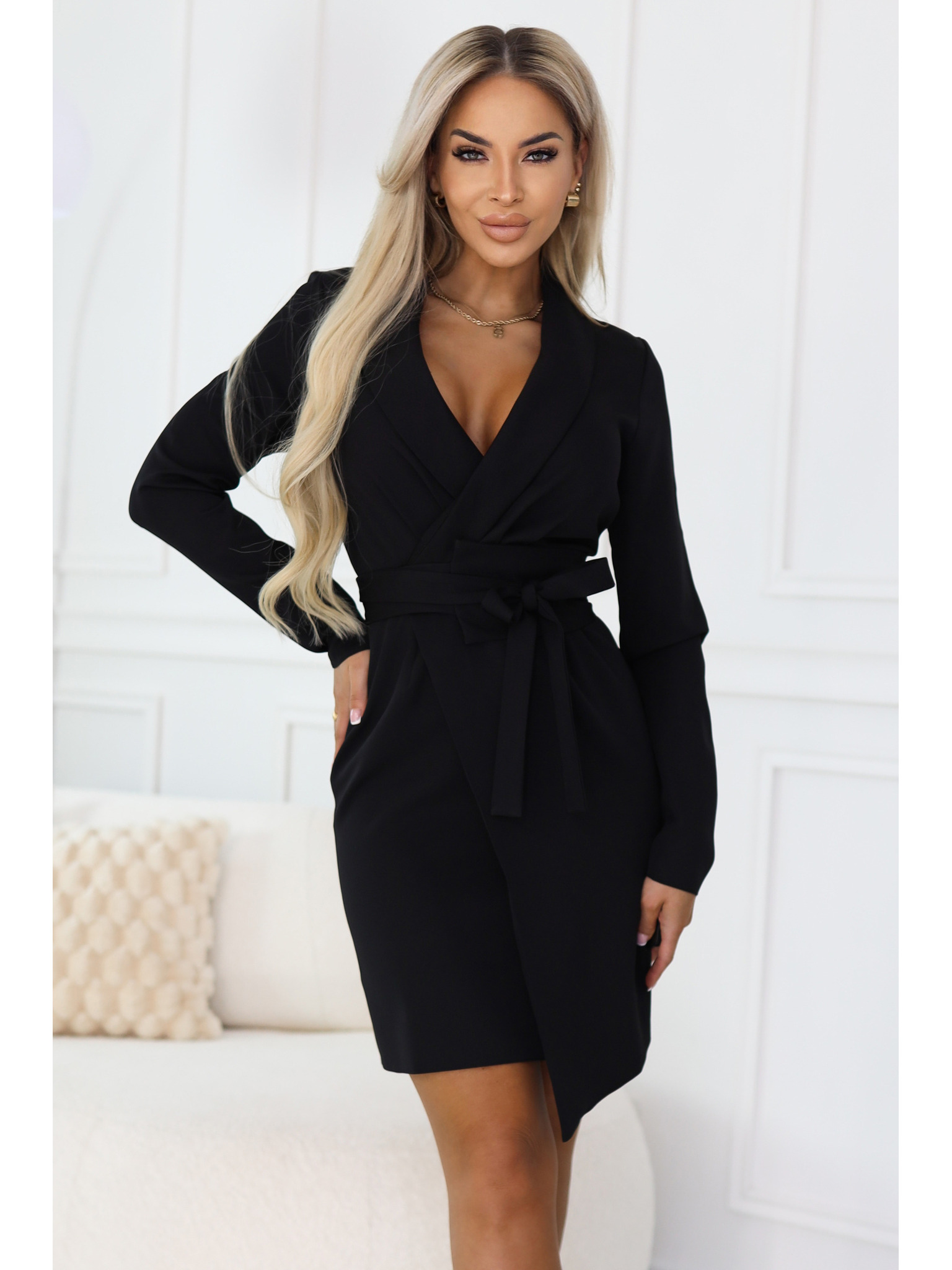 Elegantne sako haljine s pojasom i asimetričnom rubom - crne
