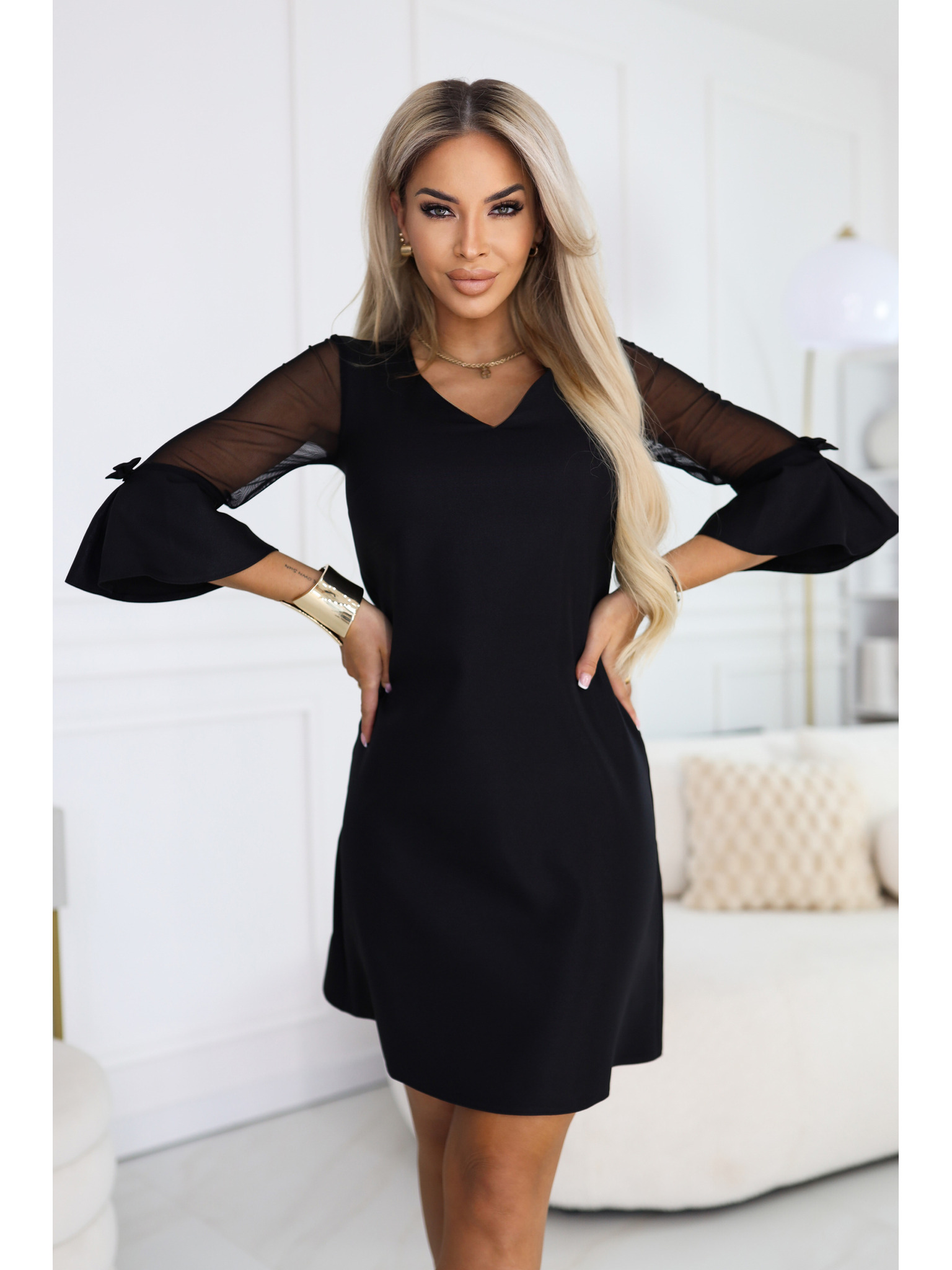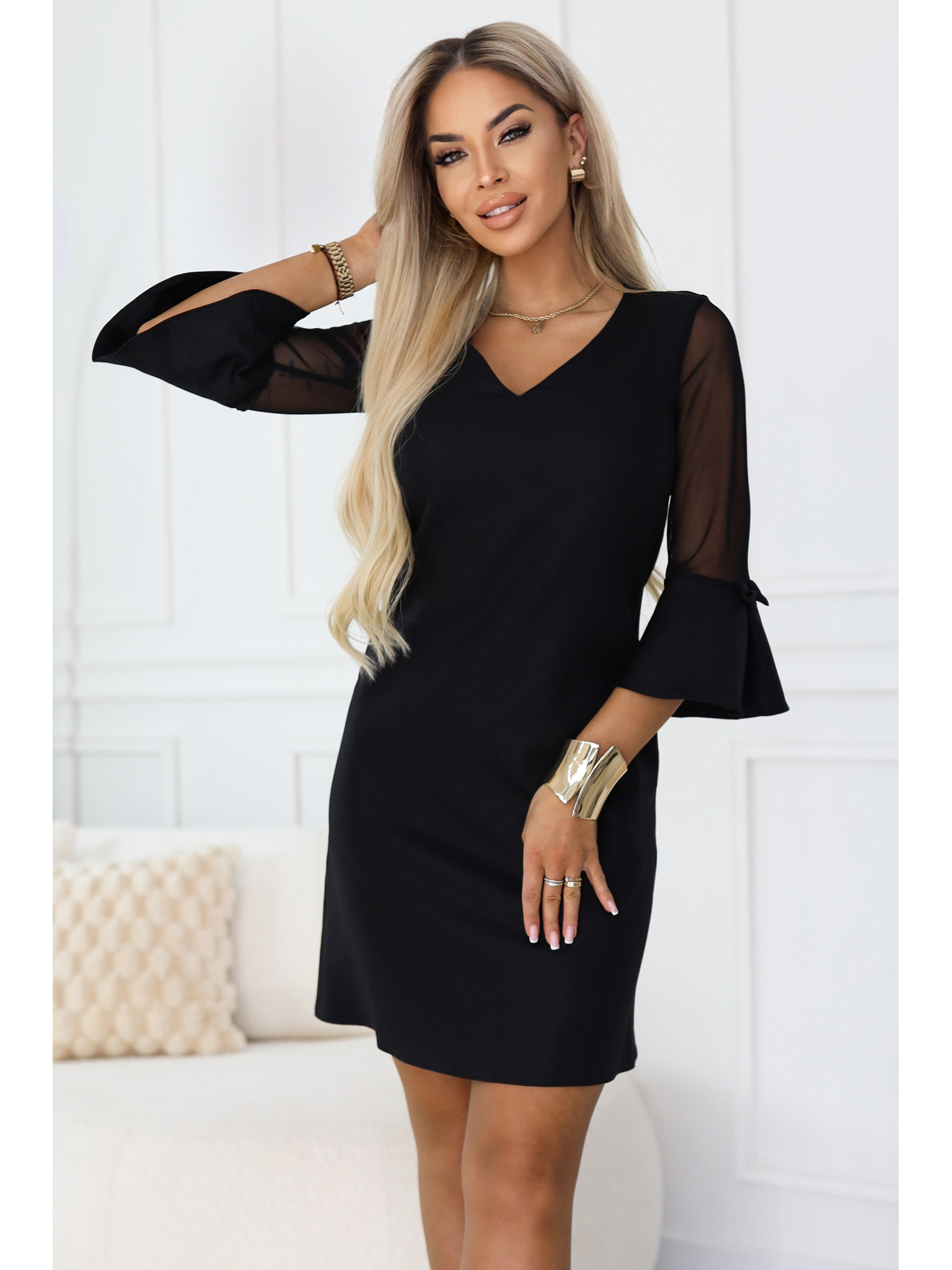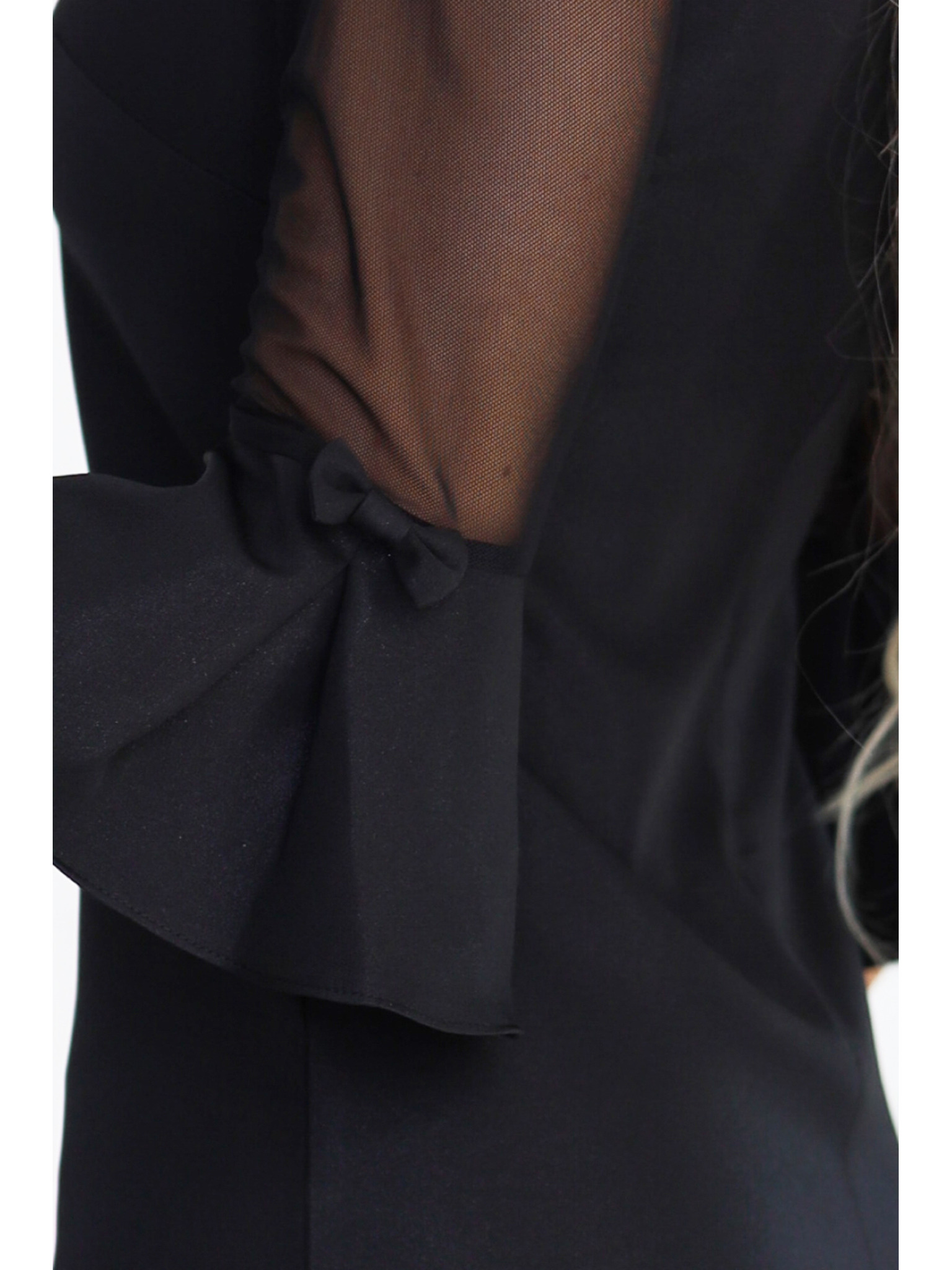 Trapezoidne trblietavé šaty s tylovými rukávmi a výstrihom V - čierne