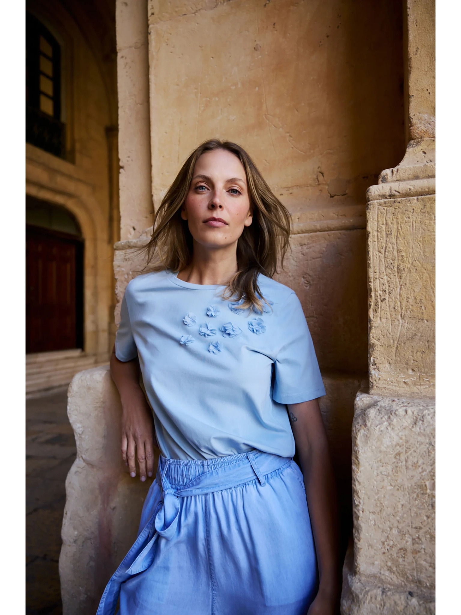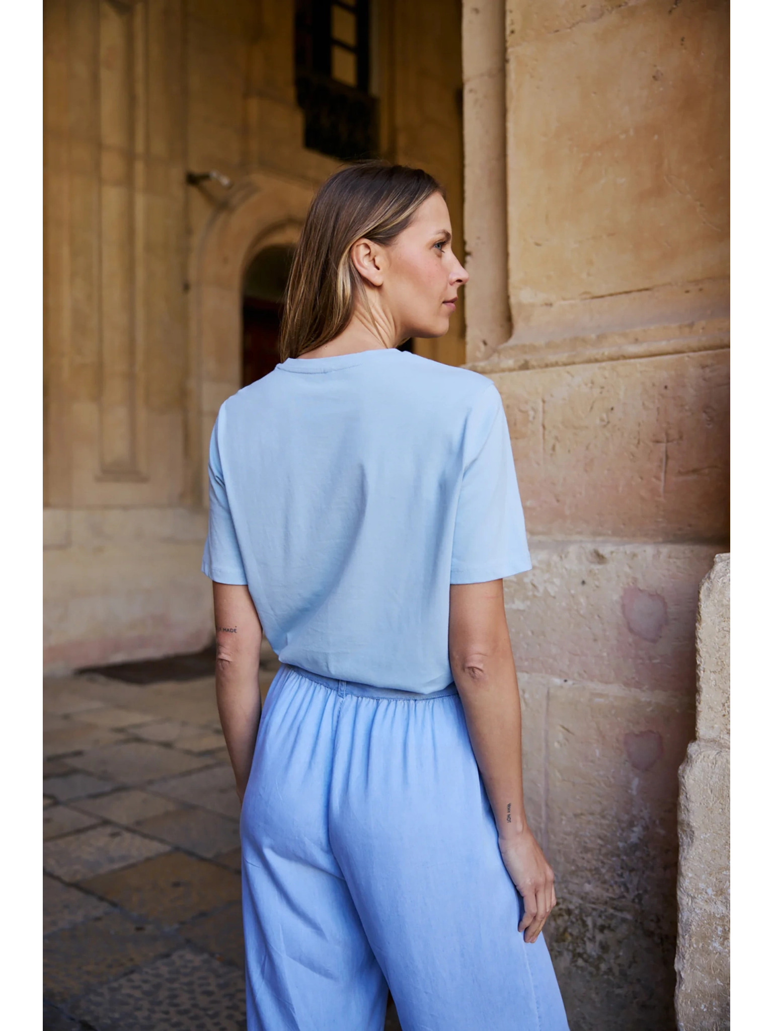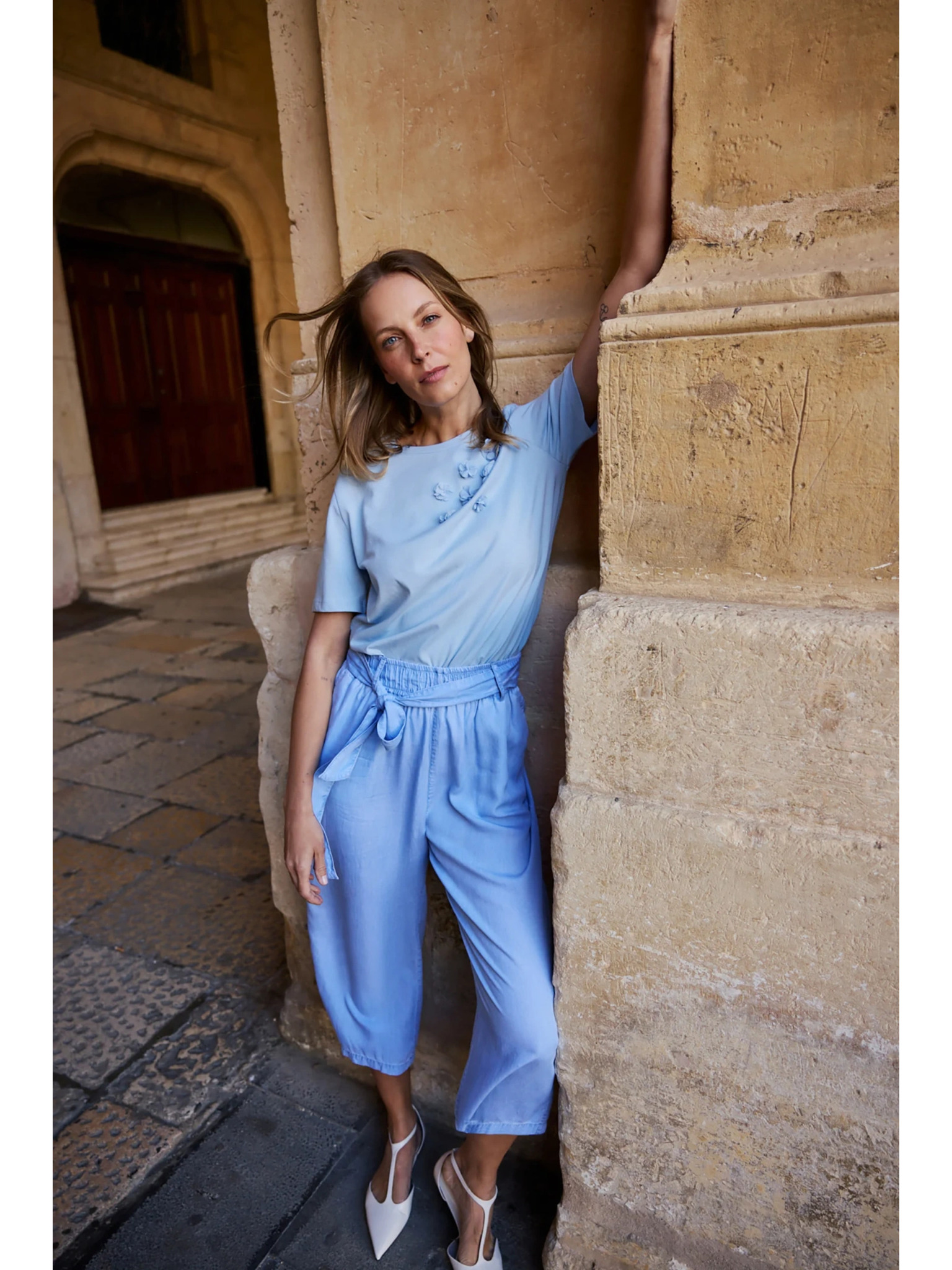 Bluza s čipkom na rukavima svetlo plava Moodo